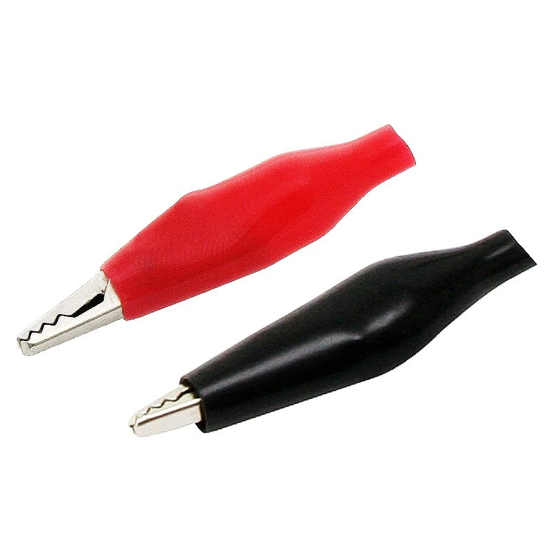 Sæt med 2 små elektrotekniske krokodillenæb med isolering, ideelle til hurtige og midlertidige elektriske forbindelser. Klemmen er fremstillet af nikkelbelagt stål, hvilket sikrer god ledningsevne og korrosionsbeskyttelse.